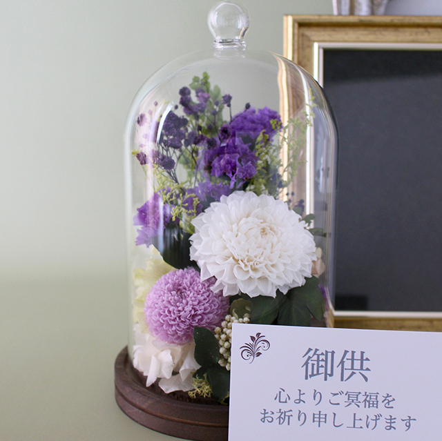 【超早割★喪中はがきが届いたらFUNERALウッドガラスドーム ダリアスターチスLVプリザーブドフラワー】