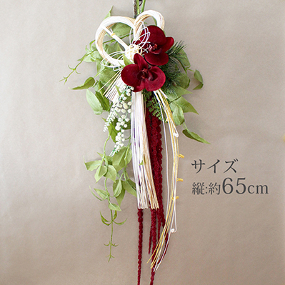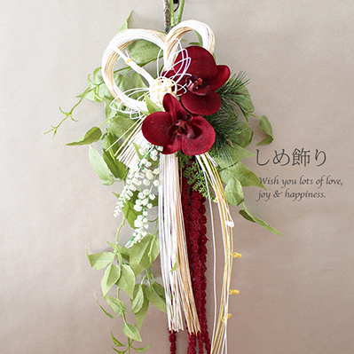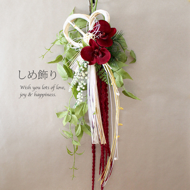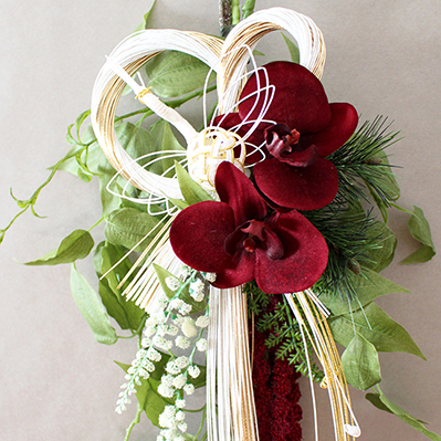 歳神様を迎えるための神聖な場所に相応しい晴れやかな花たちや、長寿・無病息災・円満・五穀豊穣を祈る縁起のよい素材を用いて華やかにデザインした和モダンなしめ飾りです。